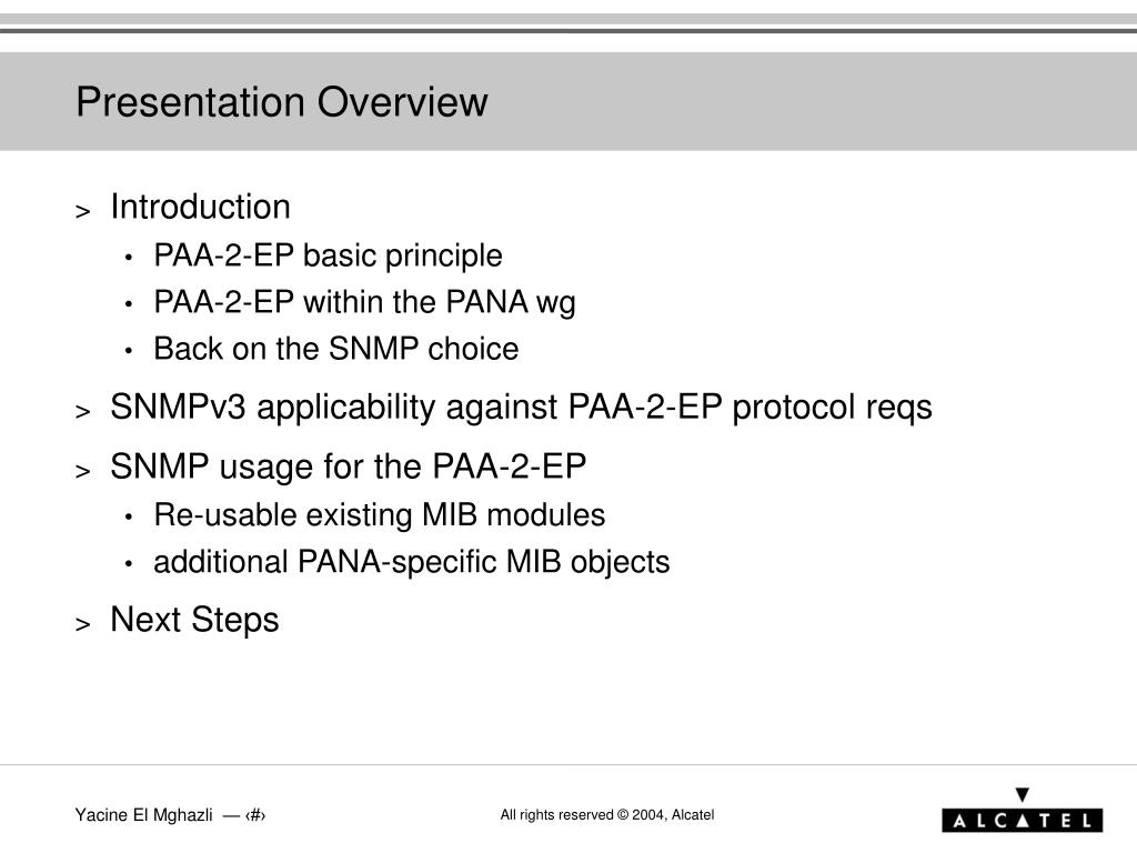 Presentation Overview Introduction PAA-2-EP basic principle PAA-2-EP within the PANA wg Back on the SNMP choice SNMPv3 applicability against PAA-2-EP protocol reqs SNMP usage for the PAA-2-EP Re-usable existing MIB modules additional PANA-specific MIB objects Next Steps