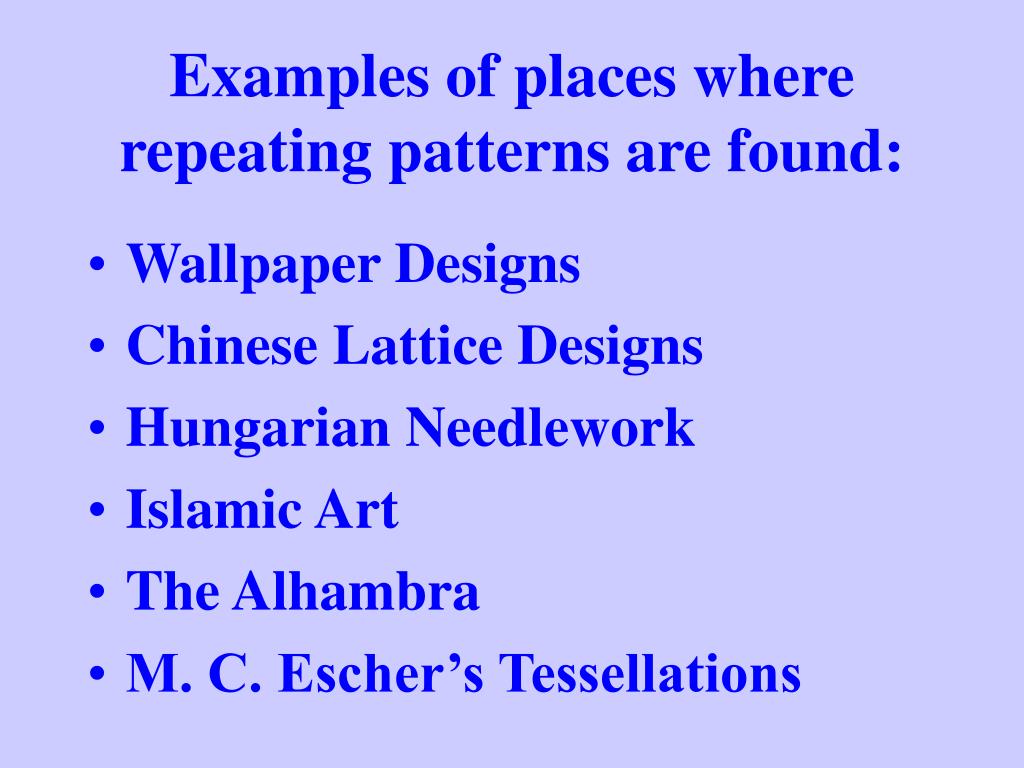 Examples of places where repeating patterns are found: • Wallpaper Designs • Chinese Lattice Designs • Hungarian Needlework • Islamic Art • The Alhambra • M. C. Escher’s Tessellations