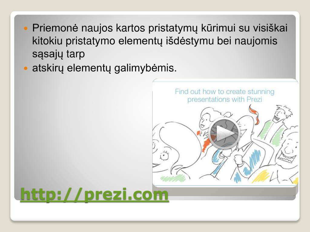 Priemonė naujos kartos pristatymų kūrimui su visiškai kitokiu pristatymo elementų išdėstymu bei naujomis sąsajų tarp • atskirų elementų galimybėmis. http://prezi.com