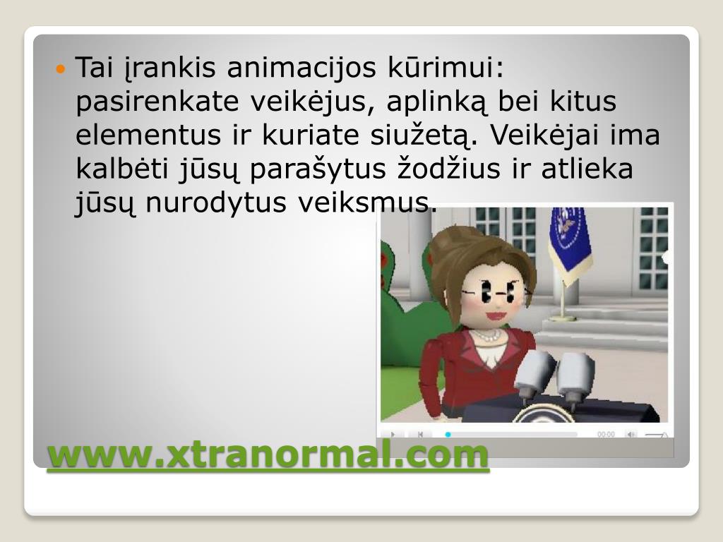 Tai įrankis animacijos kūrimui: pasirenkate veikėjus, aplinką bei kitus elementus ir kuriate siužetą. Veikėjai ima kalbėti jūsų parašytus žodžius ir atlieka jūsų nurodytus veiksmus. www.xtranormal.com