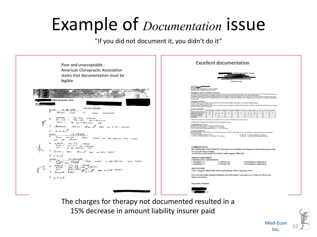 Example of Documentation issue”If you did not document it, you didn’t do it” Excellent documentation Poor and unacceptable - American Chiropractic Association states that documentation must be legible The charges for therapy not documented resulted in a 15% decrease in amount liability insurer paid Med-Econ Inc.