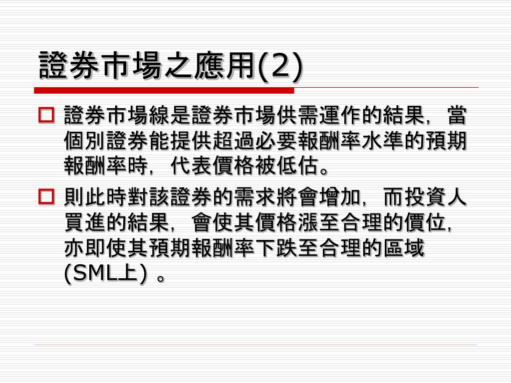 證券市場之應用(2) • 證券市場線是證券市場供需運作的結果,當個別證券能提供超過必要報酬率水準的預期報酬率時,代表價格被低估。 • 則此時對該證券的需求將會增加,而投資人買進的結果,會使其價格漲至合理的價位,亦即使其預期報酬率下跌至合理的區域(SML上) 。