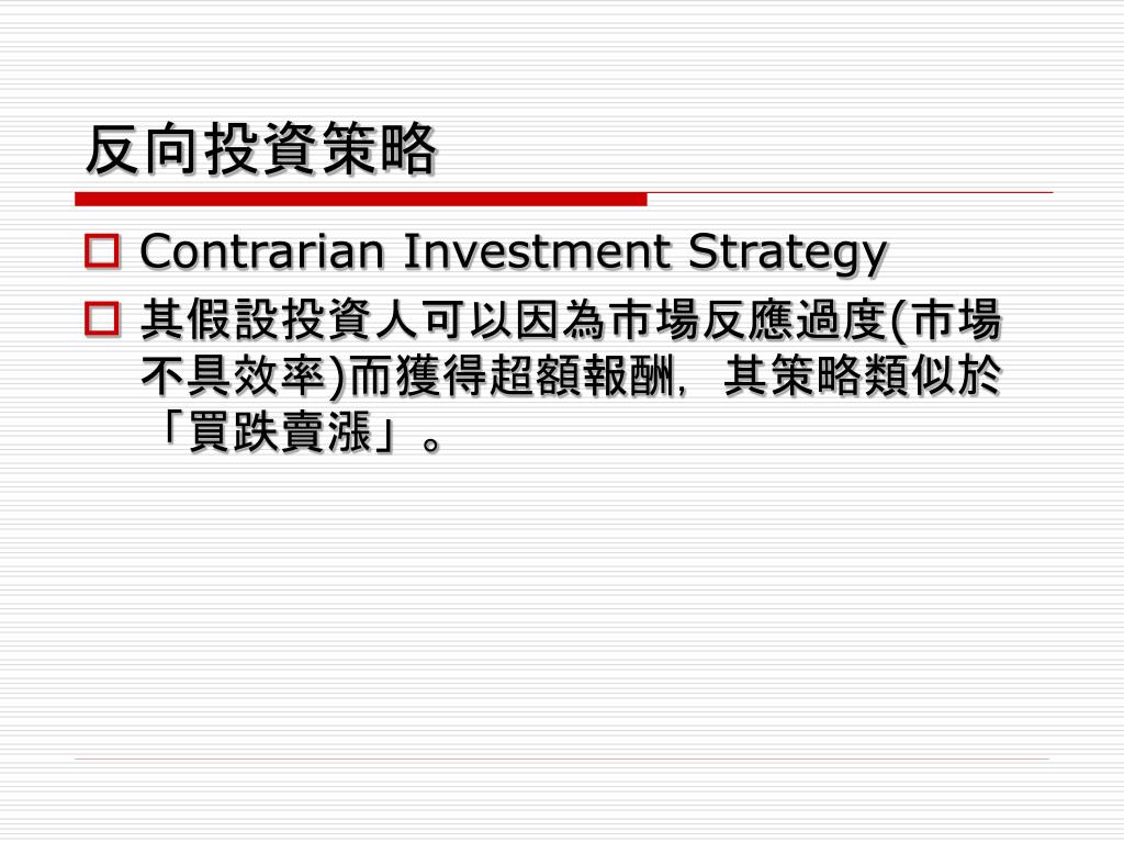 反向投資策略 • Contrarian Investment Strategy • 其假設投資人可以因為市場反應過度(市場不具效率)而獲得超額報酬,其策略類似於「買跌賣漲」。
