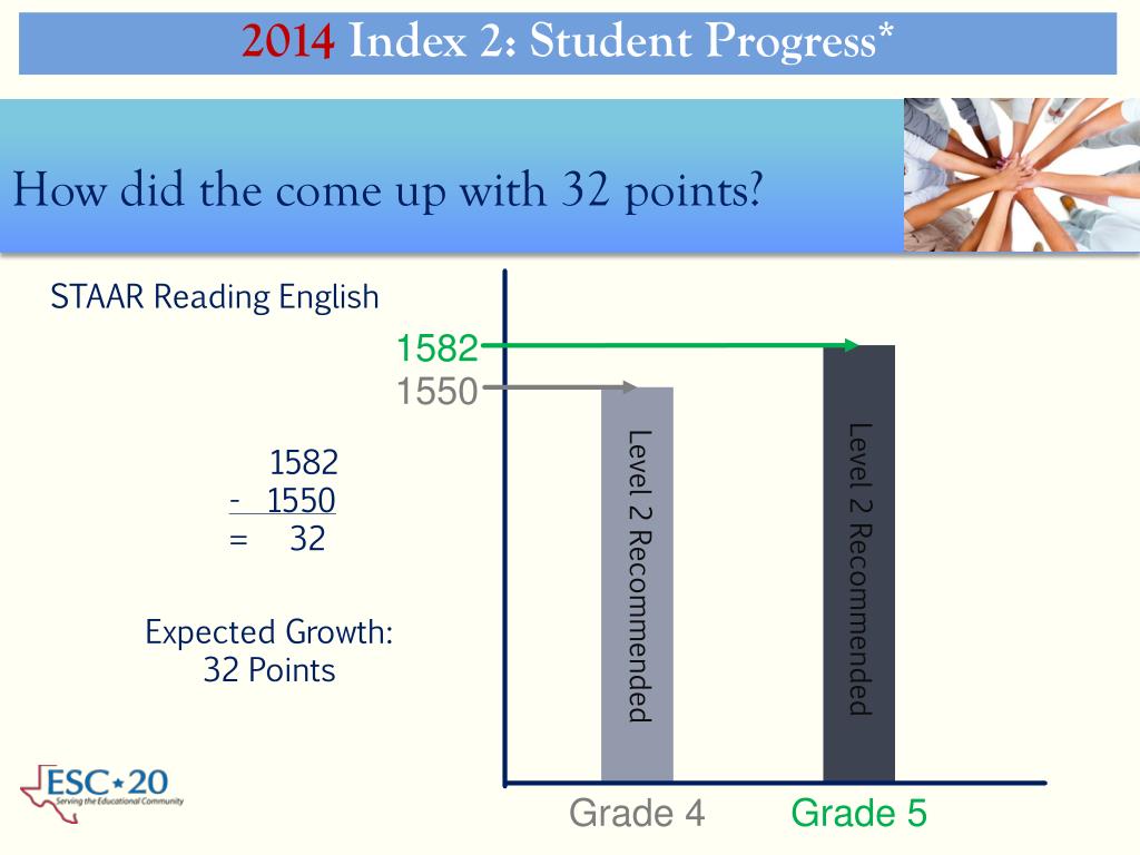 2014Index 2: Student Progress* How did the come up with 32 points? STAAR Reading English 1582 1550 1582 - 1550 = 32 Level 2 Recommended Level 2 Recommended Expected Growth: 32 Points Grade 5 Grade 4