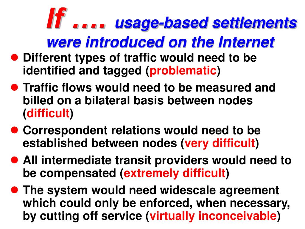 If …. usage-based settlements were introduced on the Internet • Different types of traffic would need to be identified and tagged (problematic) • Traffic flows would need to be measured and billed on a bilateral basis between nodes (difficult) • Correspondent relations would need to be established between nodes (very difficult) • All intermediate transit providers would need to be compensated (extremely difficult) • The system would need widescale agreement which could only be enforced, when necessary, by cutting off service (virtually inconceivable)