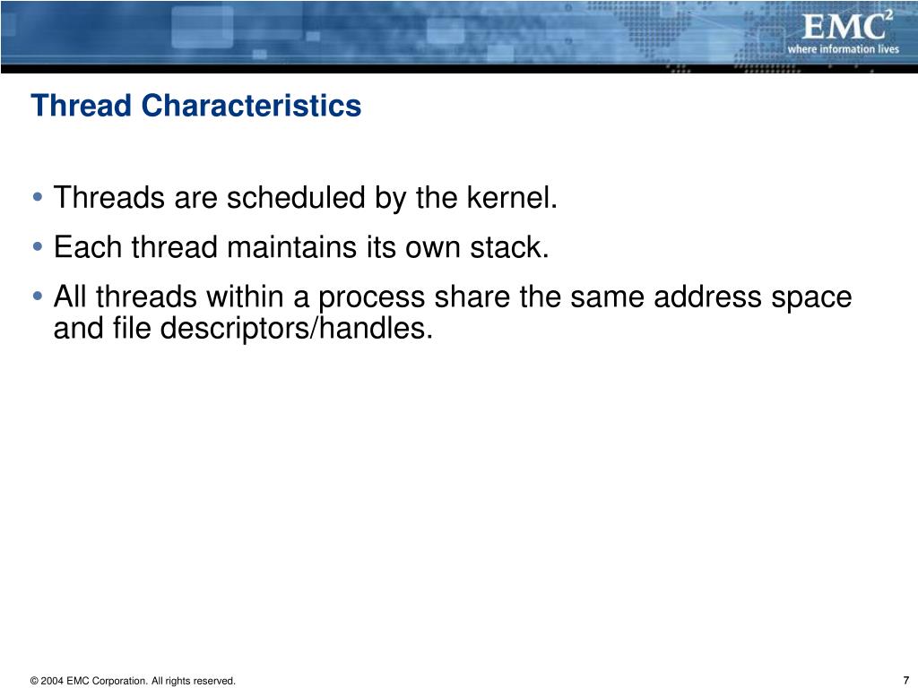 Thread Characteristics • Threads are scheduled by the kernel. • Each thread maintains its own stack. • All threads within a process share the same address space and file descriptors/handles.