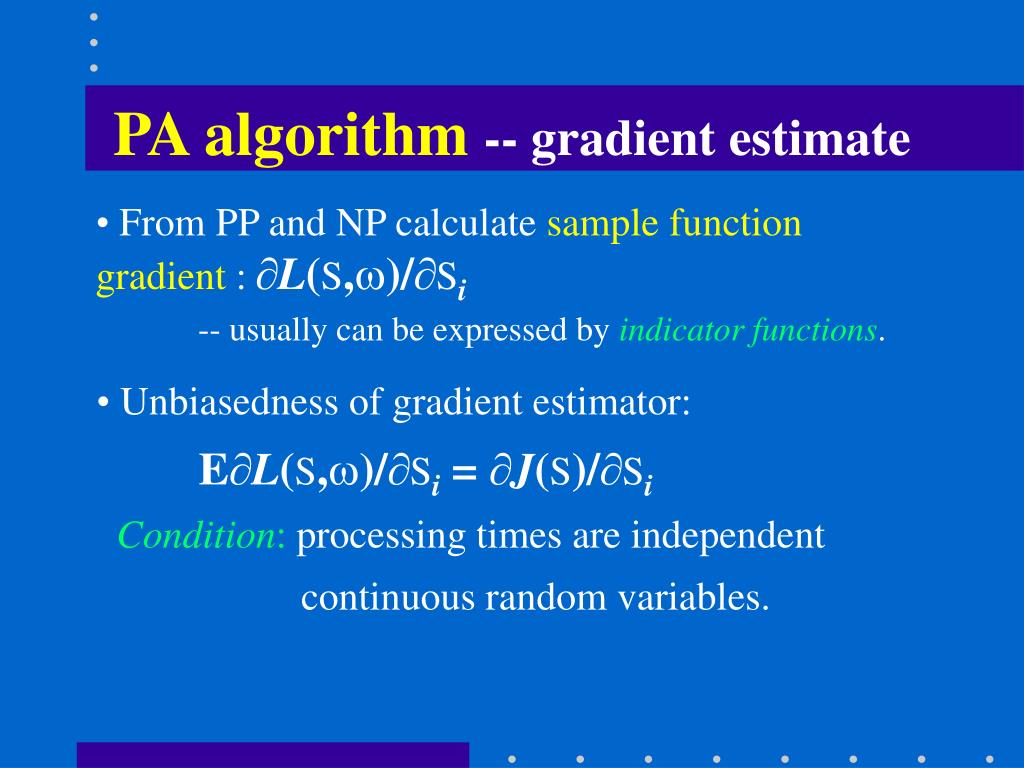 PA algorithm -- gradient estimate • From PP and NP calculate sample function gradient :¶L(S,w)/¶Si • -- usually can be expressed by indicator functions. • Unbiasedness of gradient estimator: • E¶L(S,w)/¶Si = ¶J(S)/¶Si • Condition: processing times are independent • continuous random variables.