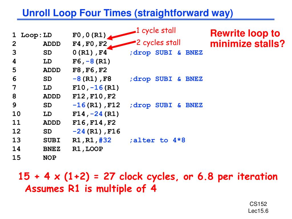 Unroll Loop Four Times (straightforward way) 1 cycle stall 1 Loop: LD F0,0(R1) 2 ADDD F4,F0,F2 3 SD 0(R1),F4 ;drop SUBI & BNEZ 4 LD F6,-8(R1) 5 ADDD F8,F6,F2 6 SD -8(R1),F8 ;drop SUBI & BNEZ 7 LD F10,-16(R1) 8 ADDD F12,F10,F2 9 SD -16(R1),F12 ;drop SUBI & BNEZ 10 LD F14,-24(R1) 11 ADDD F16,F14,F2 12 SD -24(R1),F16 13 SUBI R1,R1,#32 ;alter to 4*8 14 BNEZ R1,LOOP 15 NOP 15 + 4 x (1+2) = 27 clock cycles, or 6.8 per iteration Assumes R1 is multiple of 4 Rewrite loop to minimize stalls? 2 cycles stall