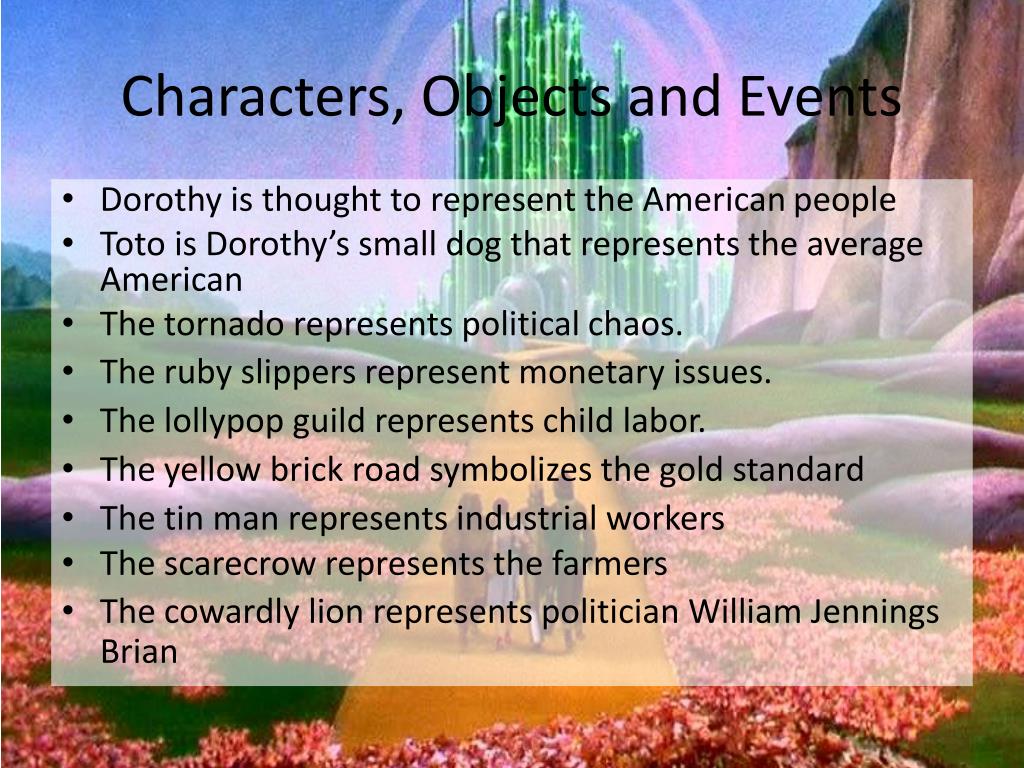 Characters, Objects and Events • Dorothy is thought to represent the American people • Toto is Dorothy’s small dog that represents the average American • The tornado represents political chaos. • The ruby slippers represent monetary issues. • The lollypop guild represents child labor. • The yellow brick road symbolizes the gold standard • The tin man represents industrial workers • The scarecrow represents the farmers • The cowardly lion represents politician William Jennings Brian