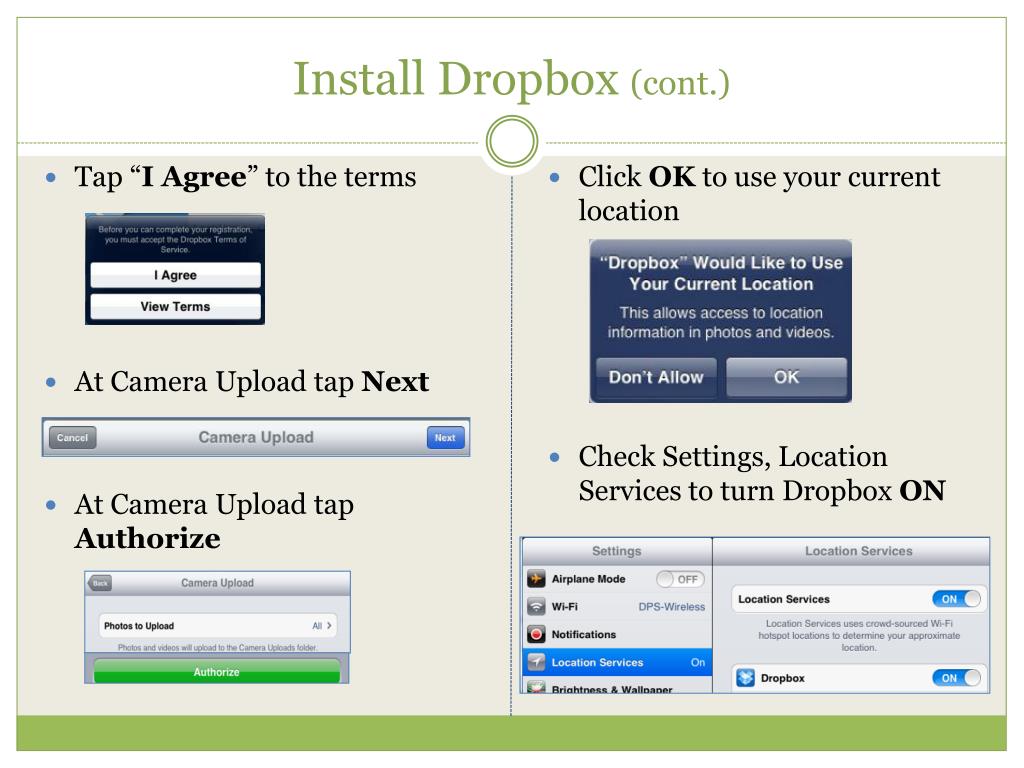 Install Dropbox (cont.) Tap “I Agree” to the terms At Camera Upload tap Next At Camera Upload tap Authorize Click OK to use your current location Check Settings, Location Services to turn Dropbox ON