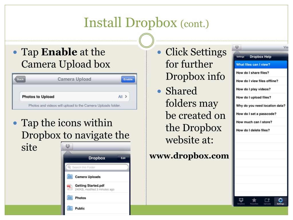 Install Dropbox (cont.) www.dropbox.com Tap Enable at the Camera Upload box Tap the icons within Dropbox to navigate the site Click Settings for further Dropbox info Shared folders may be created on the Dropbox website at: