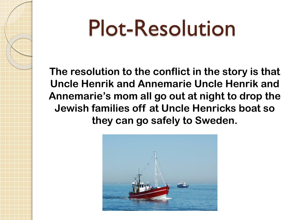 Plot-Resolution The resolution to the conflict in the story is that Uncle Henrik and Annemarie Uncle Henrik and Annemarie’s mom all go out at night to drop the Jewish families off at Uncle Henricks boat so they can go safely to Sweden.