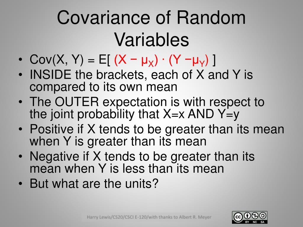 Covariance of Random Variables Cov(X, Y) = E[ (X − μX) ∙ (Y −μY) ] INSIDE the brackets, each of X and Y is compared to its own mean The OUTER expectation is with respect to the joint probability that X=x AND Y=y Positive if X tends to be greater than its mean when Y is greater than its mean Negative if X tends to be greater than its mean when Y is less than its mean But what are the units?