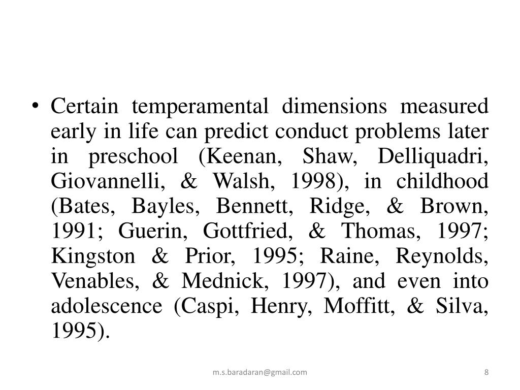 Certain temperamental dimensions measured early in life can predict conduct problems later in preschool (Keenan, Shaw, Delliquadri, Giovannelli, & Walsh, 1998), in childhood (Bates, Bayles, Bennett, Ridge, & Brown, 1991; Guerin, Gottfried, & Thomas, 1997; Kingston & Prior, 1995; Raine, Reynolds, Venables, & Mednick, 1997), and even into adolescence (Caspi, Henry, Moffitt, & Silva, 1995). m.s.baradaran@gmail.com