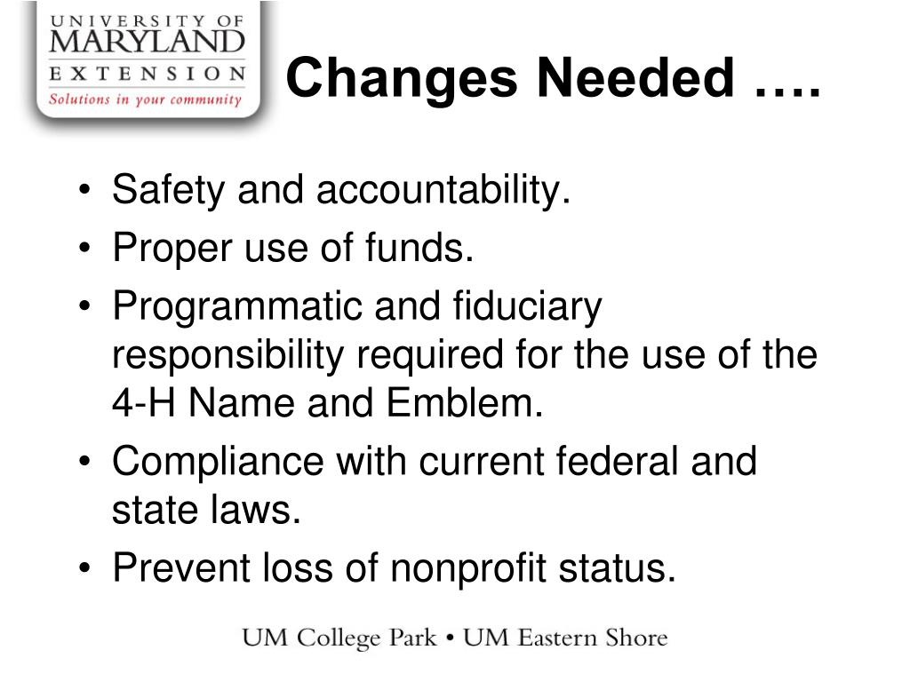 Changes Needed …. • Safety and accountability. • Proper use of funds. • Programmatic and fiduciary responsibility required for the use of the 4-H Name and Emblem. • Compliance with current federal and state laws. • Prevent loss of nonprofit status.