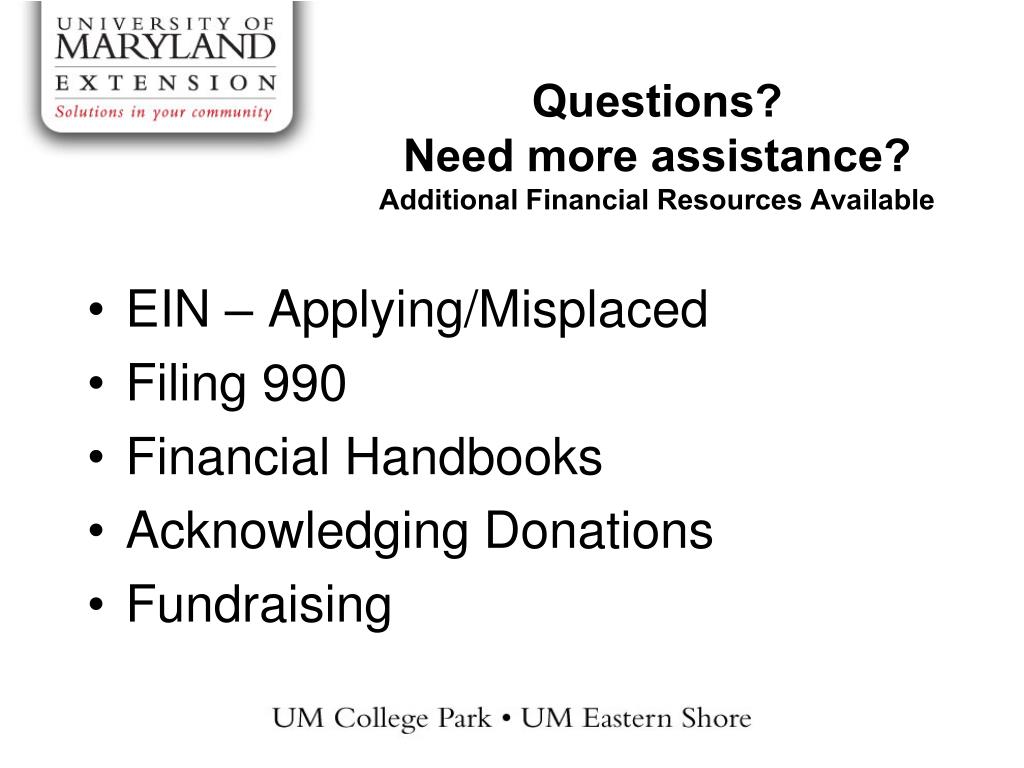 Questions? Need more assistance? Additional Financial Resources Available • EIN – Applying/Misplaced • Filing 990 • Financial Handbooks • Acknowledging Donations • Fundraising