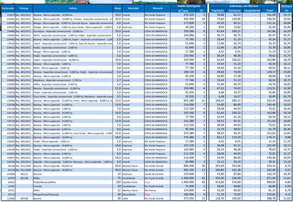 Equipe Rodrigo Flecha Ferreira Alves Superintendente de Apoio à Gestão de Recursos Hídricos Cláudio Pereira Especialista em Recursos Hídricos Gláucia Maria Oliveira Assistente Marco Antônio Mota Amorim Especialista em Recursos Hídricos Luiza Carolina S. Cruz Negreiros Estagiária Giordano Bruno B. de Carvalho Especialista em Recursos Hídricos Gerente de Cobrança pelo Uso de Recurso Hídricos Izabela Braga Neiva de Santana Especialista em Recursos Hídricos Cristiano Cária Guimarães Pereira Especialista em Recursos Hídricos Geison de Figueiredo Laport Assistente Jéssica dos Reis R. do Nascimento Assistente