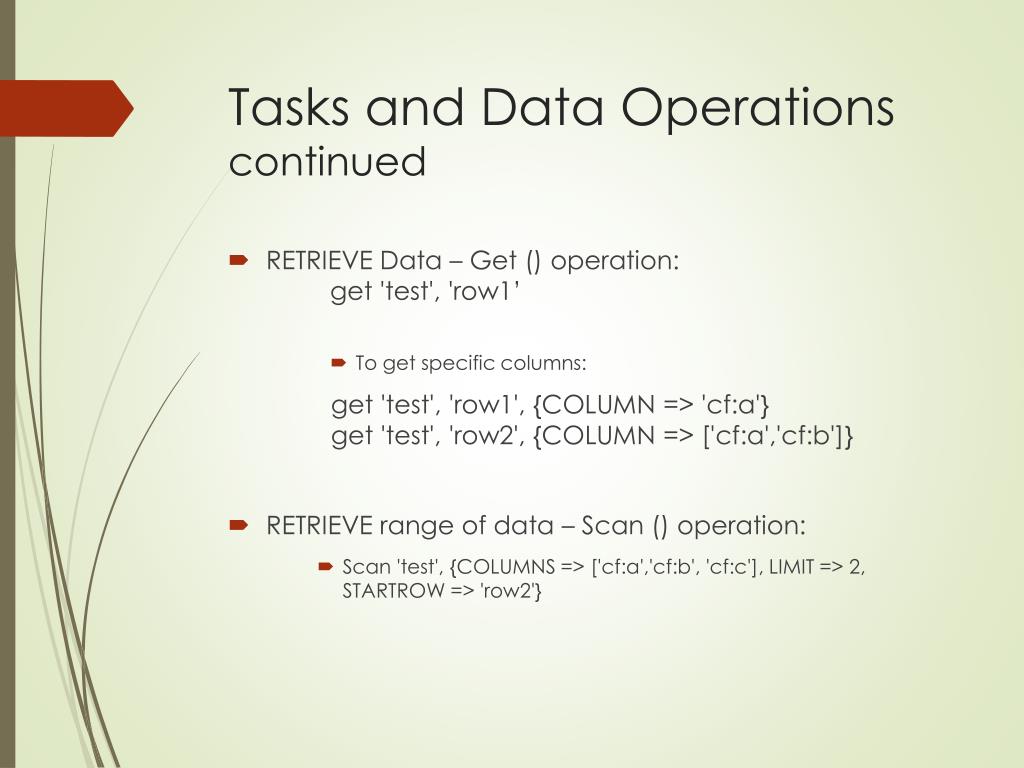 Tasks and Data Operations continued • RETRIEVE Data – Get () operation: get 'test', 'row1’ • To get specific columns: get'test', 'row1', {COLUMN => 'cf:a'}get 'test', 'row2', {COLUMN => ['cf:a','cf:b']} • RETRIEVE range of data – Scan () operation: • Scan 'test', {COLUMNS => ['cf:a','cf:b', 'cf:c'], LIMIT => 2, STARTROW => 'row2'}