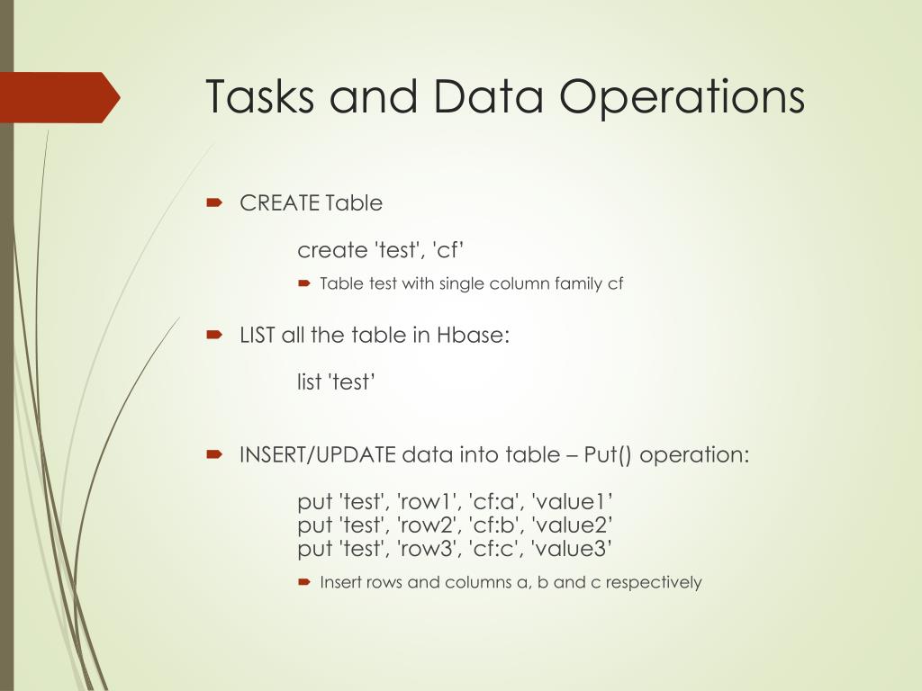Tasks and Data Operations continued • DISBALE Table: disable 'test’ • DROP Table: drop 'test'