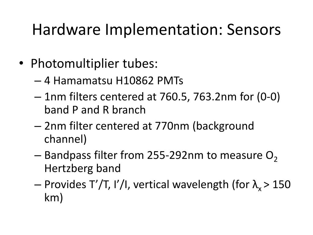 Hardware Implementation: Sensors • Photomultiplier tubes: • 4 Hamamatsu H10862 PMTs • 1nm filters centered at 760.5, 763.2nm for (0-0) band P and R branch • 2nm filter centered at 770nm (background channel) • Bandpass filter from 255-292nm to measure O2 Hertzberg band • Provides T’/T, I’/I, vertical wavelength (for λx > 150 km)