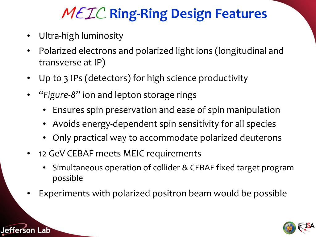 MEIC Ring-Ring Design Features Ultra-high luminosity Polarized electrons and polarized light ions (longitudinal and transverse at IP) Up to 3 IPs (detectors) for high science productivity “Figure-8” ion and lepton storage rings Ensures spin preservation and ease of spin manipulation Avoids energy-dependent spin sensitivity for all species Only practical way to accommodate polarized deuterons 12 GeV CEBAF meets MEIC requirements Simultaneous operation of collider & CEBAF fixed target program possible Experiments with polarized positron beam would be possible