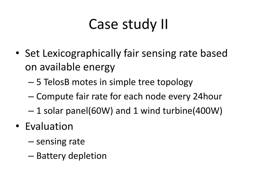 Case study II • Set Lexicographically fair sensing rate based on available energy • 5 TelosB motes in simple tree topology • Compute fair rate for each node every 24hour • 1 solar panel(60W) and 1 wind turbine(400W) • Evaluation • sensing rate • Battery depletion