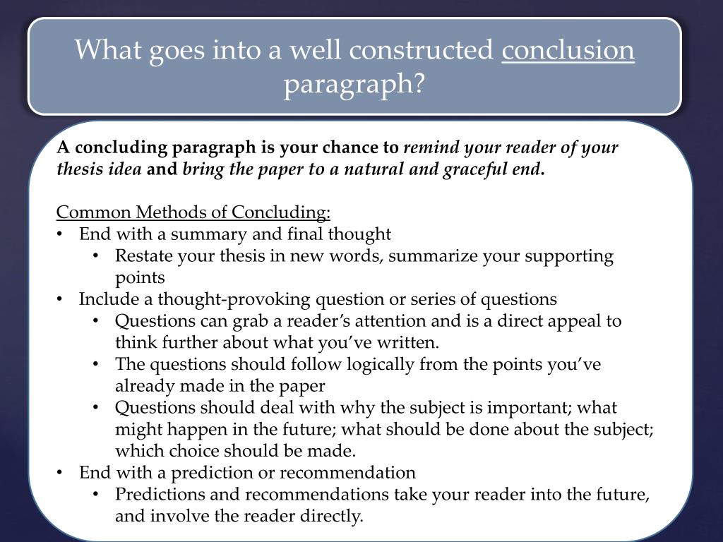 What goes into a well constructed conclusion paragraph? • A concluding paragraph is your chance to remind your reader of your thesis idea and bring the paper to a natural and graceful end. • Common Methods of Concluding: • End with a summary and final thought • Restate your thesis in new words, summarize your supporting points • Include a thought-provoking question or series of questions • Questions can grab a reader’s attention and is a direct appeal to think further about what you’ve written. • The questions should follow logically from the points you’ve already made in the paper • Questions should deal with why the subject is important; what might happen in the future; what should be done about the subject; which choice should be made. • End with a prediction or recommendation • Predictions and recommendations take your reader into the future, and involve the reader directly.