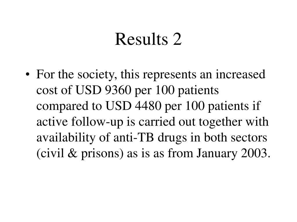 Results 2 • For the society, this represents an increased cost of USD 9360 per 100 patients compared to USD 4480 per 100 patients if active follow-up is carried out together with availability of anti-TB drugs in both sectors (civil & prisons) as is as from January 2003.