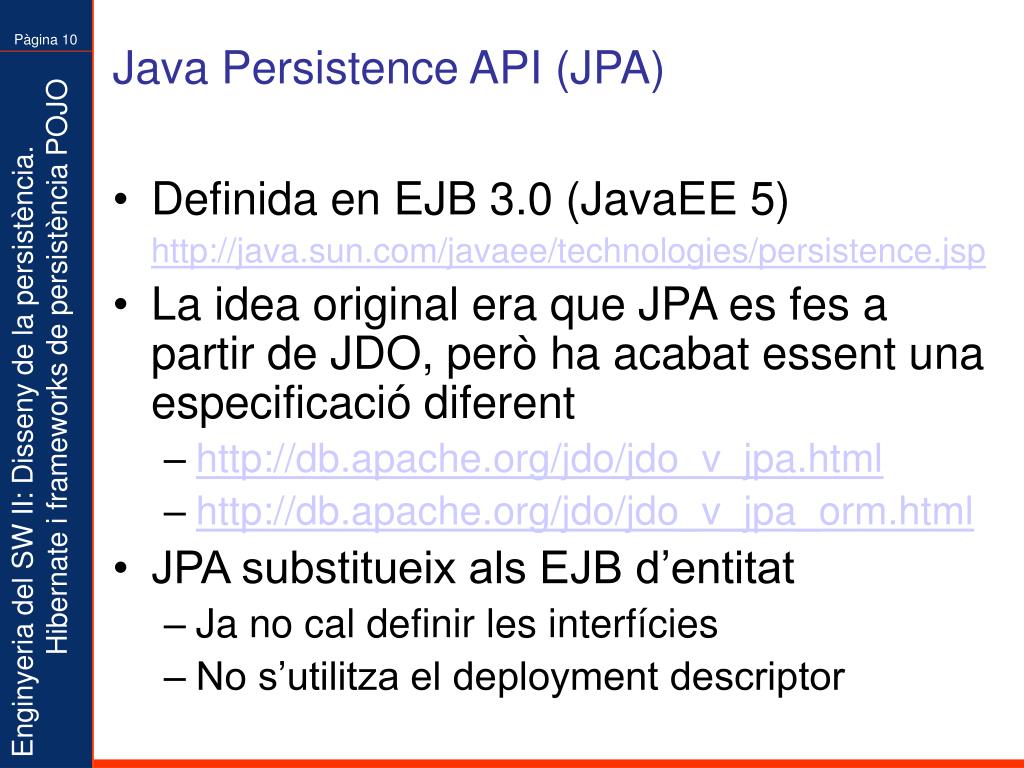 Java Persistence API (JPA) • Definida en EJB 3.0 (JavaEE 5) http://java.sun.com/javaee/technologies/persistence.jsp • La idea original era que JPA es fes a partir de JDO, però ha acabat essent una especificació diferent • http://db.apache.org/jdo/jdo_v_jpa.html • http://db.apache.org/jdo/jdo_v_jpa_orm.html • JPA substitueix als EJB d’entitat • Ja no cal definir les interfícies • No s’utilitza el deployment descriptor