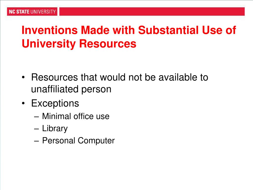 Inventions Made with Substantial Use of University Resources • Resources that would not be available to unaffiliated person • Exceptions • Minimal office use • Library • Personal Computer