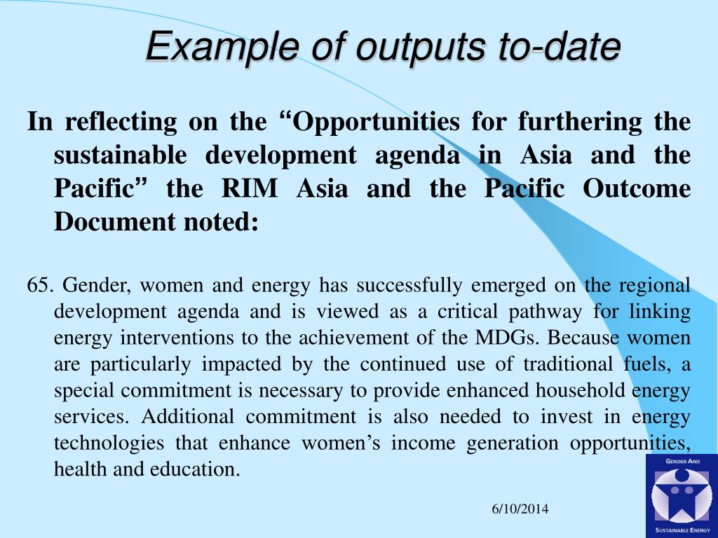 Example of outputs to-date In reflecting on the “Opportunities for furthering the sustainable development agenda in Asia and the Pacific” the RIM Asia and the Pacific Outcome Document noted: 65. Gender, women and energy has successfully emerged on the regional development agenda and is viewed as a critical pathway for linking energy interventions to the achievement of the MDGs. Because women are particularly impacted by the continued use of traditional fuels, a special commitment is necessary to provide enhanced household energy services. Additional commitment is also needed to invest in energy technologies that enhance women’s income generation opportunities, health and education.