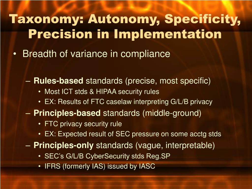 Taxonomy: Autonomy, Specificity, Precision in Implementation • Breadth of variance in compliance • Rules-based standards (precise, most specific) • Most ICT stds & HIPAA security rules • EX: Results of FTC caselaw interpreting G/L/B privacy • Principles-based standards (middle-ground) • FTC privacy security rule • EX: Expected result of SEC pressure on some acctg stds • Principles-only standards (vague, interpretable) • SEC’s G/L/B CyberSecurity stds Reg.SP • IFRS (formerly IAS) issued by IASC