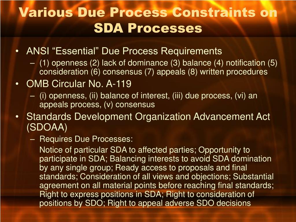 Various Due Process Constraints on SDA Processes • ANSI “Essential” Due Process Requirements • (1) openness (2) lack of dominance (3) balance (4) notification (5) consideration (6) consensus (7) appeals (8) written procedures • OMB Circular No. A-119 • (i) openness, (ii) balance of interest, (iii) due process, (vi) an appeals process, (v) consensus • Standards Development Organization Advancement Act (SDOAA) • Requires Due Processes: Notice of particular SDA to affected parties; Opportunity to participate in SDA; Balancing interests to avoid SDA domination by any single group; Ready access to proposals and final standards; Consideration of all views and objections; Substantial agreement on all material points before reaching final standards; Right to express positions in SDA; Right to consideration of positions by SDO; Right to appeal adverse SDO decisions