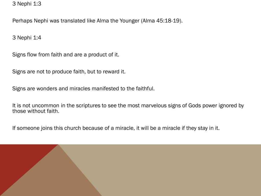 3 Nephi 1:3 Perhaps Nephi was translated like Alma the Younger (Alma 45:18-19). 3 Nephi 1:4 Signs flow from faith and are a product of it. Signs are not to produce faith, but to reward it. Signs are wonders and miracles manifested to the faithful. It is not uncommon in the scriptures to see the most marvelous signs of Gods power ignored by those without faith. If someone joins this church because of a miracle, it will be a miracle if they stay in it.