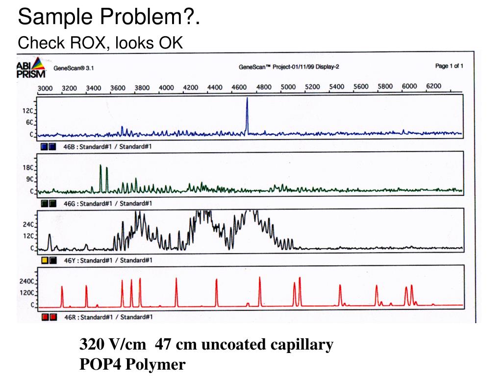 Sample Problem?. Check ROX, looks OK 320 V/cm 47 cm uncoated capillary POP4 Polymer