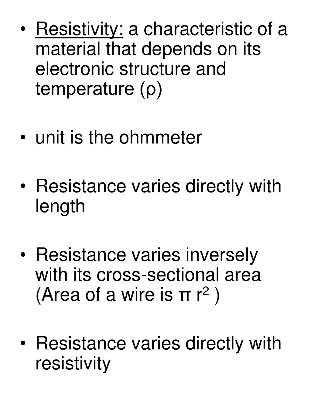 Resistivity: a characteristic of a material that depends on its electronic structure and temperature (ρ) • unit is the ohmmeter • Resistance varies directly with length • Resistance varies inversely with its cross-sectional area (Area of a wire is π r2 ) • Resistance varies directly with resistivity