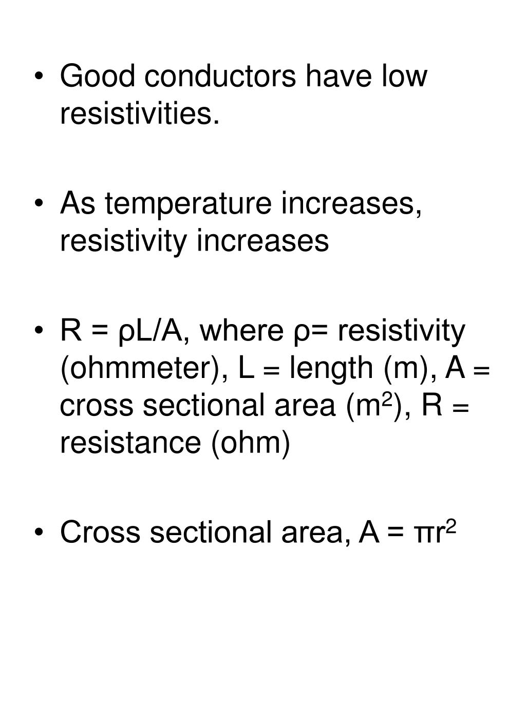 Good conductors have low resistivities. • As temperature increases, resistivity increases • R = ρL/A, where ρ= resistivity (ohmmeter), L = length (m), A = cross sectional area (m2), R = resistance (ohm) • Cross sectional area, A = πr2