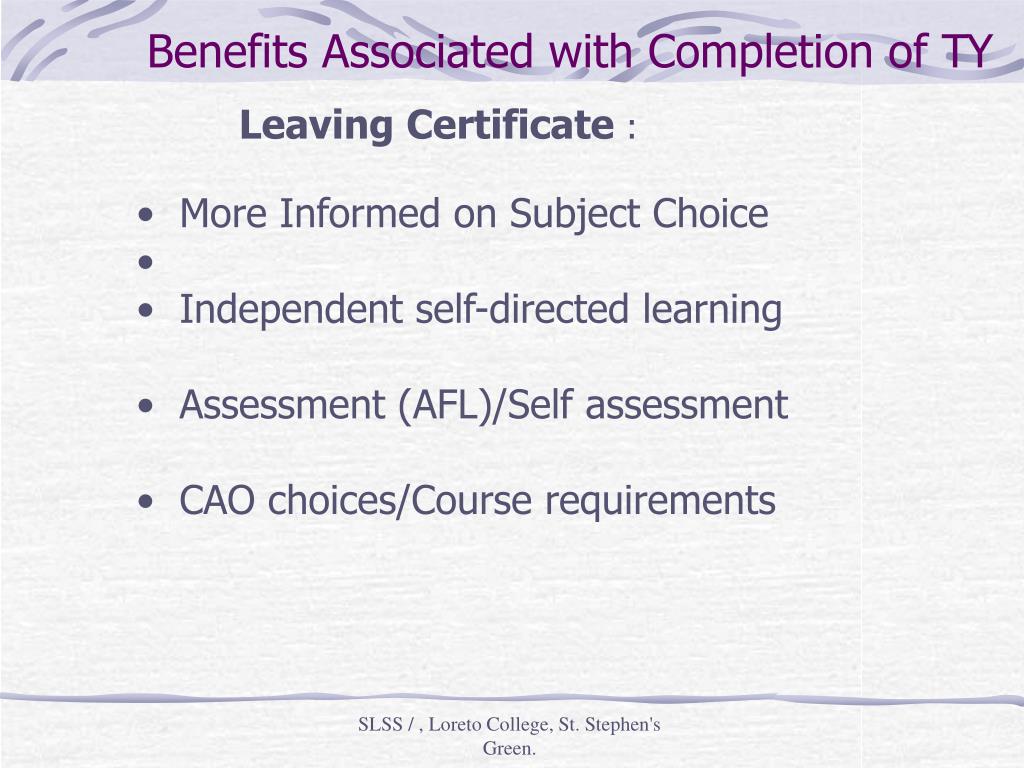 Benefits Associated with Completion of TY • Leaving Certificate : • More Informed on Subject Choice • Independent self-directed learning • Assessment (AFL)/Self assessment • CAO choices/Course requirements SLSS / , Loreto College, St. Stephen's Green.