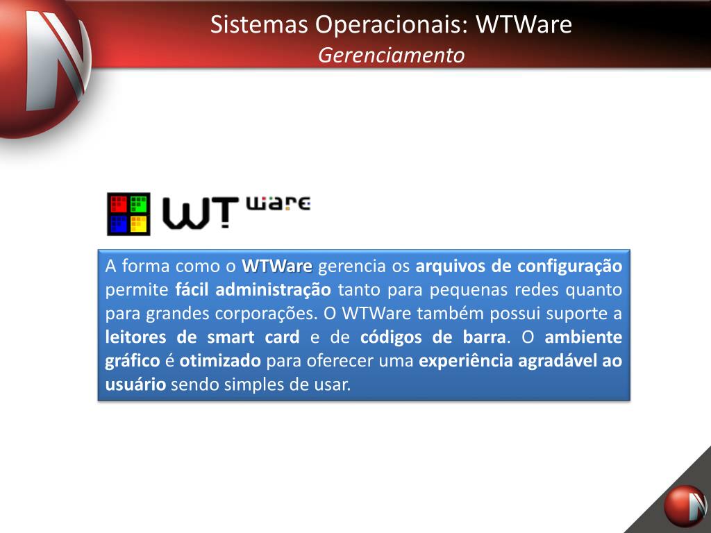 Sistemas Operacionais: WTWare Gerenciamento A forma como o WTWare gerencia os arquivos de configuração permite fácil administração tanto para pequenas redes quanto para grandes corporações. O WTWare também possui suporte a leitores de smartcard e de códigos de barra. O ambiente gráfico é otimizado para oferecer uma experiência agradável ao usuário sendo simples de usar.