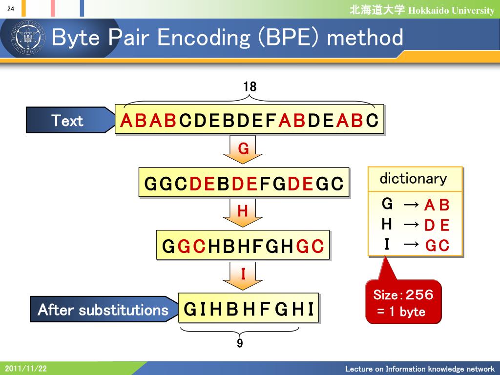 dictionary G AB → H → DE I → GC Byte Pair Encoding (BPE)method 18 ABABCDEBDEFABDEABC Text G GGCDEBDEFGDEGC H GGCHBHFGHGC I Size:256 = 1 byte GIHBHFGHI After substitutions 9 Lecture on Information knowledge network
