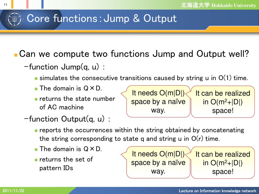 Core functions:Jump & Output • Can we compute two functions Jump andOutput well? • functionJump(q, u) : • simulates the consecutive transitions caused by stringu in O(1) time. • The domain is Q×D. • returns the state numberof AC machine • functionOutput(q, u) : • reports the occurrences within the string obtained by concatenating the string corresponding to state q and string u in O(r) time. • The domain is Q×D. • returns the set of pattern IDs It needs O(m|D|) space by a naïve way. It can be realized in O(m2+|D|) space! It needs O(m|D|) space by a naïve way. It can be realized in O(m2+|D|) space! Lecture on Information knowledge network