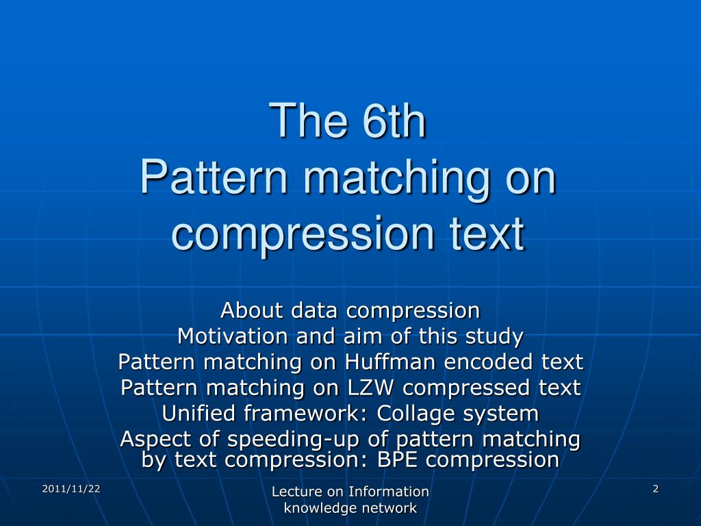 The 6thPattern matching on compression text About data compression Motivation and aim of this study Pattern matching on Huffman encoded text Pattern matching on LZW compressed text Unified framework: Collage system Aspect of speeding-up of pattern matching by text compression: BPE compression Lecture on Information knowledge network