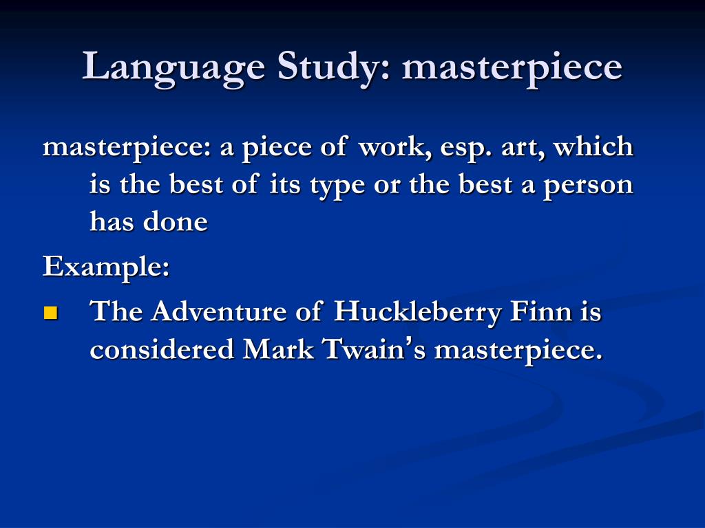 Language Study: masterpiece masterpiece: a piece of work, esp. art, which is the best of its type or the best a person has done Example: • The Adventure of Huckleberry Finn is considered Mark Twain’s masterpiece.