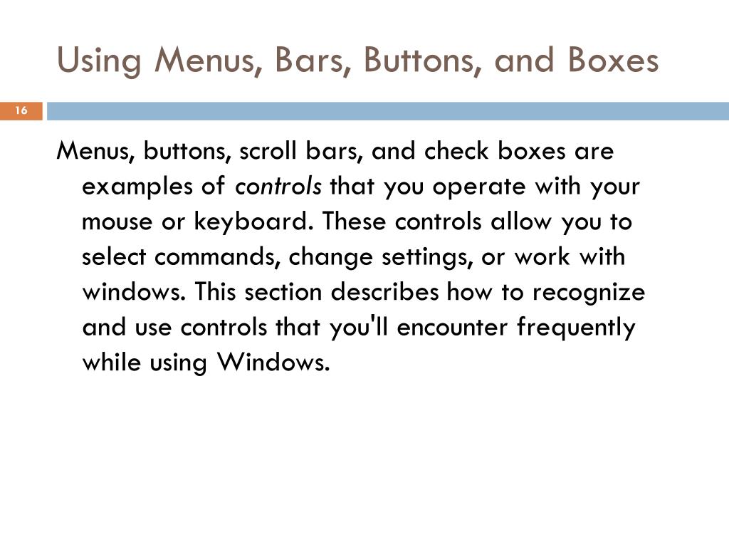 Using Menus, Bars, Buttons, and Boxes Menus, buttons, scroll bars, and check boxes are examples of controls that you operate with your mouse or keyboard. These controls allow you to select commands, change settings, or work with windows. This section describes how to recognize and use controls that you'll encounter frequently while using Windows.