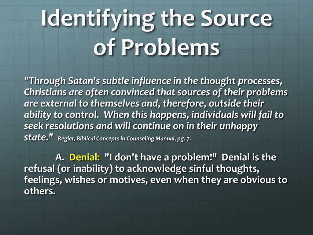 Identifying the Source of Problems "Through Satan's subtle influence in the thought processes, Christians are often convinced that sources of their problems are external to themselves and, therefore, outside their ability to control. When this happens, individuals will fail to seek resolutions and will continue on in their unhappy state." Regier, Biblical Concepts in Counseling Manual, pg. 7. A. Denial: "I don't have a problem!" Denial is the refusal (or inability) to acknowledge sinful thoughts, feelings, wishes or motives, even when they are obvious to others.