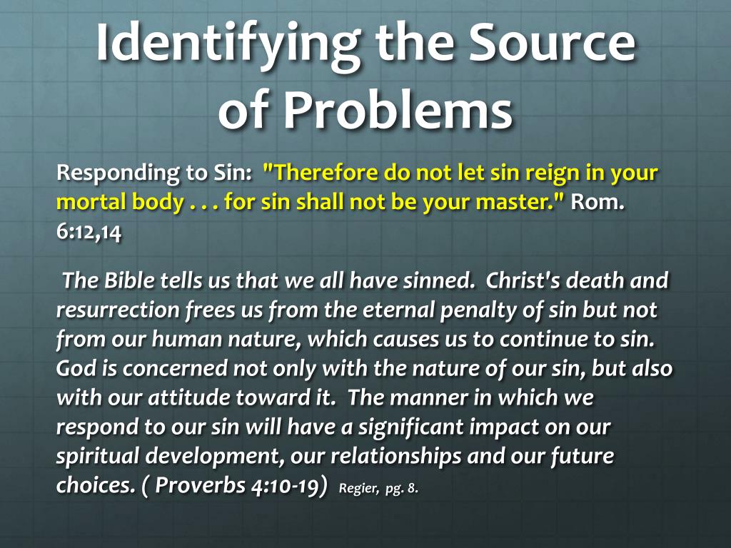 Identifying the Source of Problems Responding to Sin: "Therefore do not let sin reign in your mortal body . . . for sin shall not be your master." Rom. 6:12,14 The Bible tells us that we all have sinned. Christ's death and resurrection frees us from the eternal penalty of sin but not from our human nature, which causes us to continue to sin. God is concerned not only with the nature of our sin, but also with our attitude toward it. The manner in which we respond to our sin will have a significant impact on our spiritual development, our relationships and our future choices. ( Proverbs 4:10-19) Regier, pg. 8.