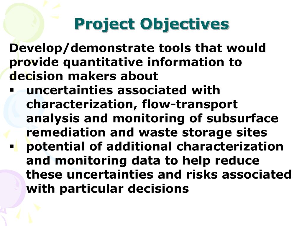 Project Objectives • Develop/demonstrate tools that would provide quantitative information to decision makers about • uncertainties associated with characterization, flow-transport analysis and monitoring of subsurface remediation and waste storage sites • potential of additional characterization and monitoring data to help reduce these uncertainties and risks associated with particular decisions