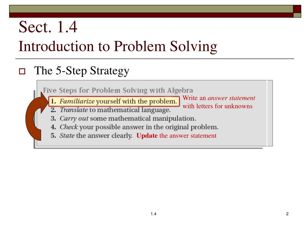Sect. 1.4Introduction to Problem Solving • The 5-Step Strategy Write an answer statementwith letters for unknowns Update the answer statement 1.4