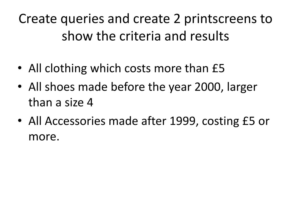 Create queries and create 2 printscreens to show the criteria and results • All clothing which costs more than £5 • All shoes made before the year 2000, larger than a size 4 • All Accessories made after 1999, costing £5 or more.