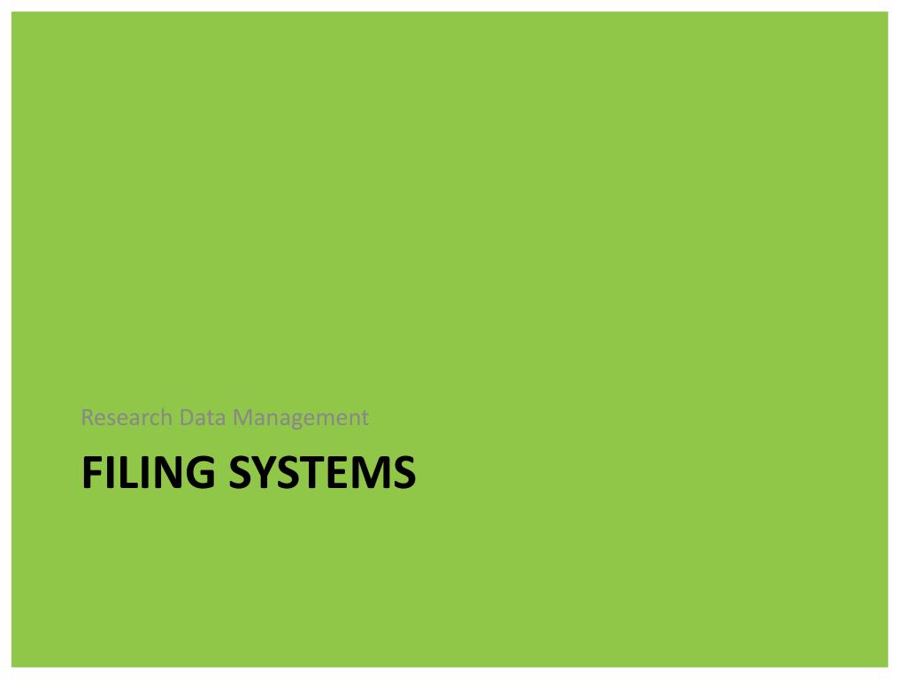 Research Data Management. Filing systems. Research Data Management Filing Systems. Filing is more than saving files, it’s making sure you can find them later in your project. Naming Directory Structure File Types Versioning All these help to keep your data safe and accessible. My Project.
